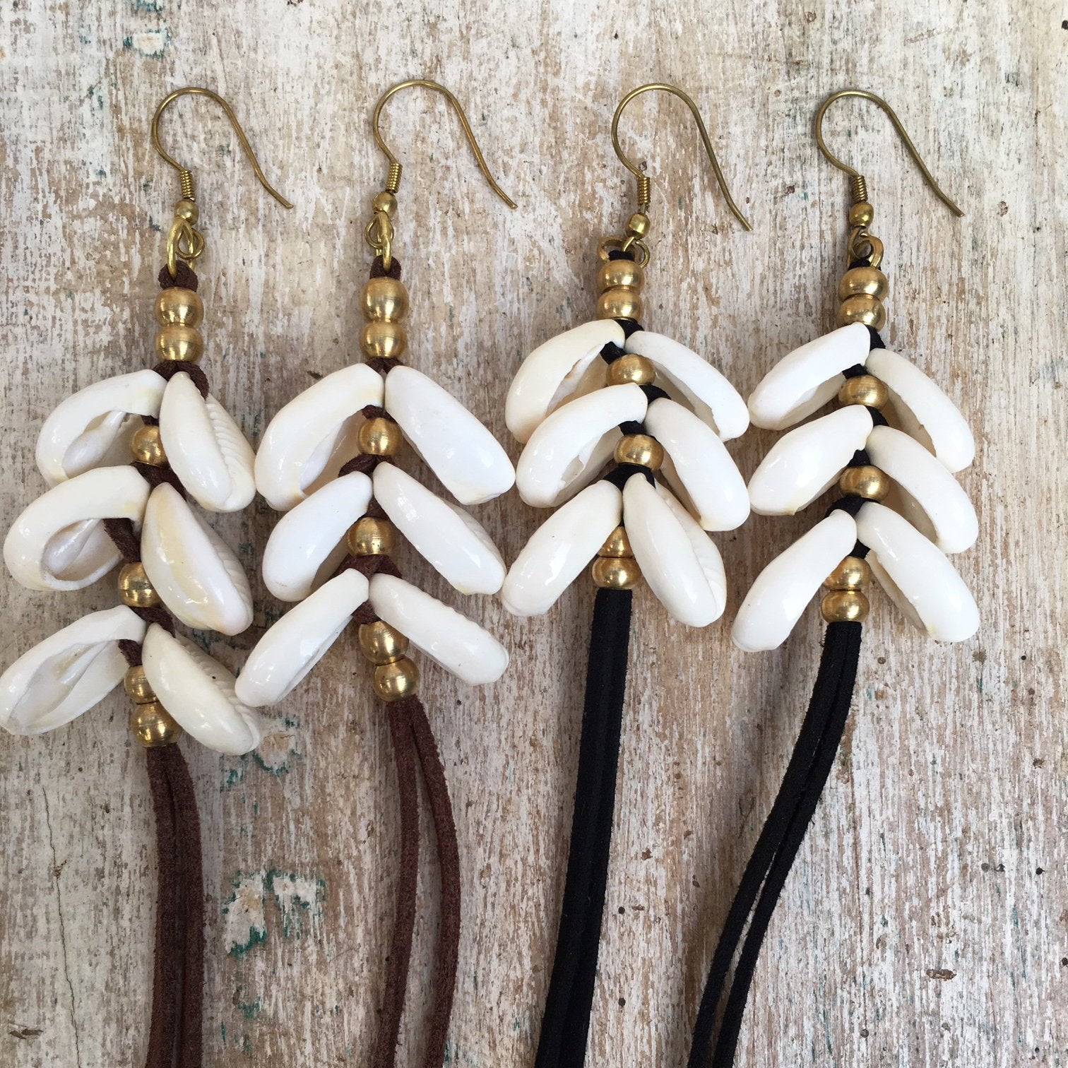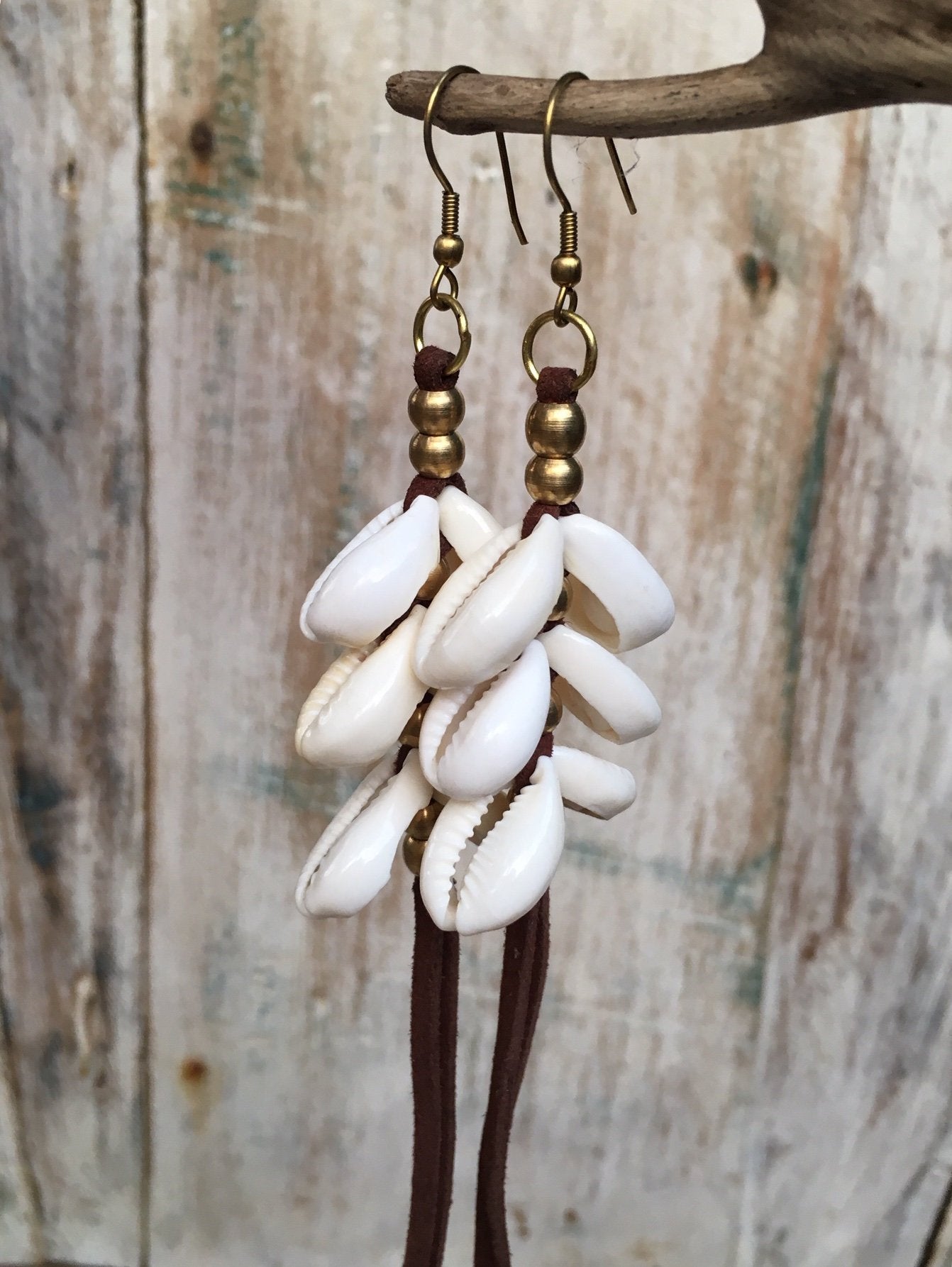 Simply irresistible… cowrie shell beauty at its best. These earrings feature a cascade of six shells accentuated by round brass beads and gorgeous long vegan leather fringe.