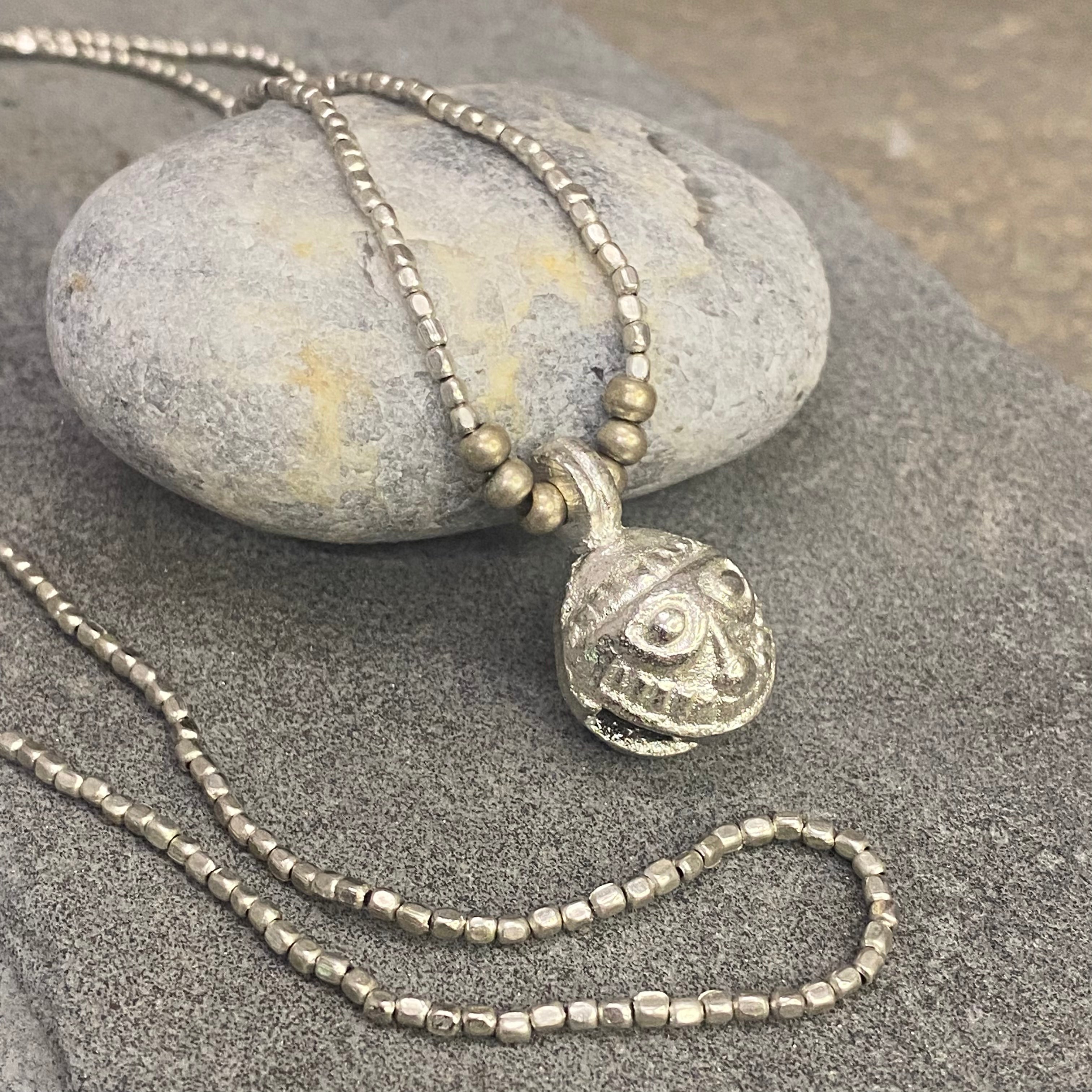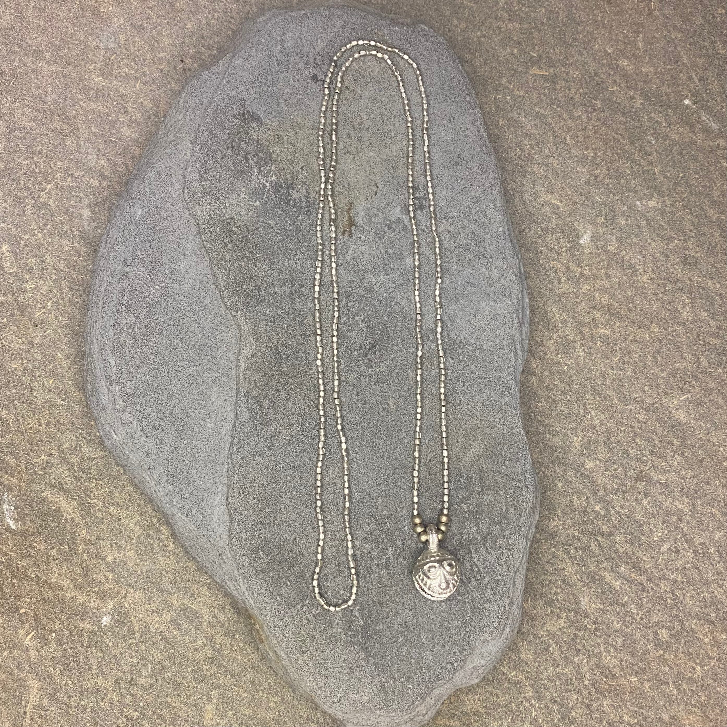 This pendant is a celebration of found objects and wanderlust, featuring a deeply textured, antique-style relic. Strung on a chain of finely beaded silver plated brass, it carries an organic, earthy weight that connects the wearer to bohemian tradition. Perfect for layering on wearing alone.