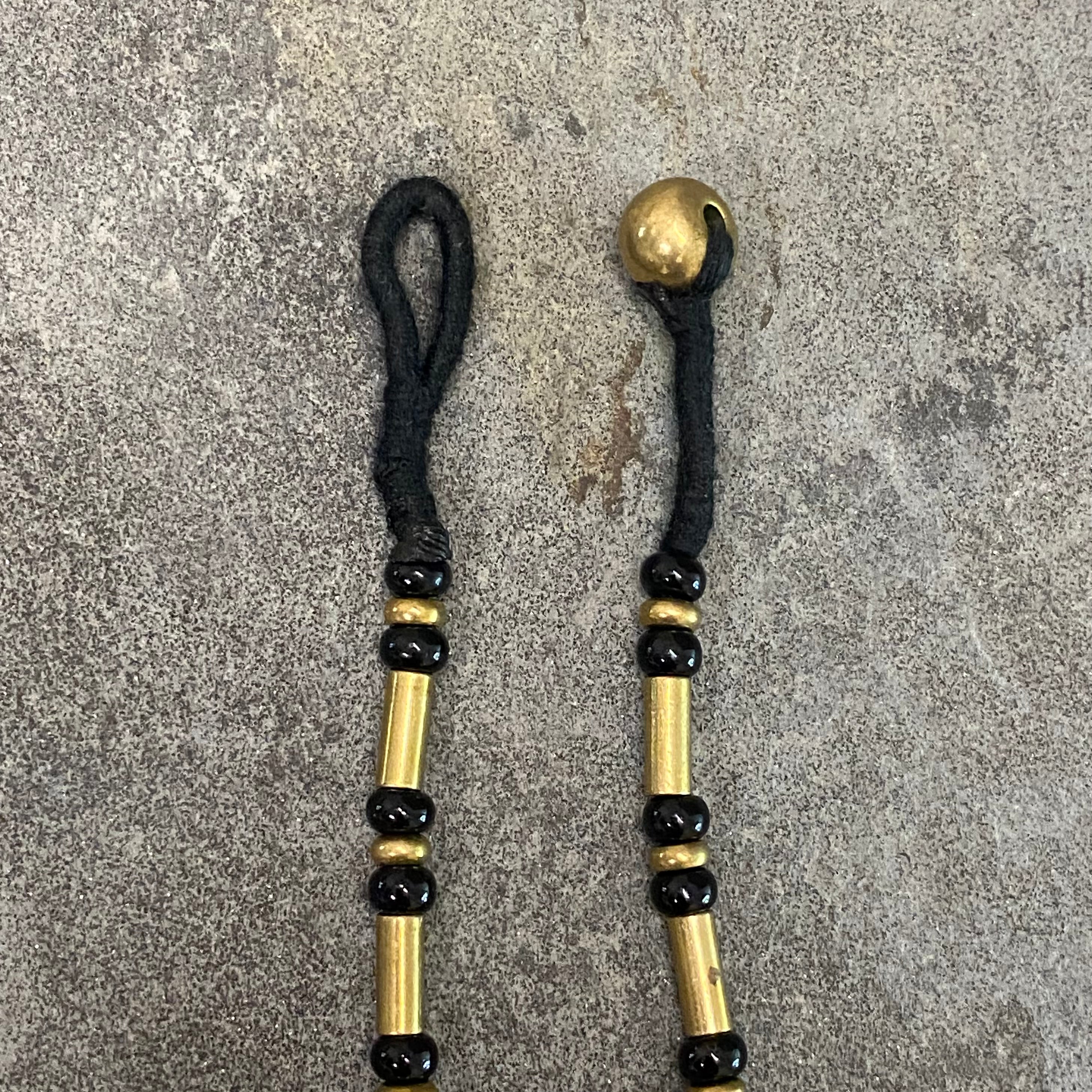 This necklace features a cascade of three graduated brass discs, each individually etched with a radiant sun-like texture. The bold pendant hangs from a double strand of contrasting brass and black beads, creating a rhythmic design that is both ancient and modern. Perfect for when you need a high-impact, bohemian statement piece.