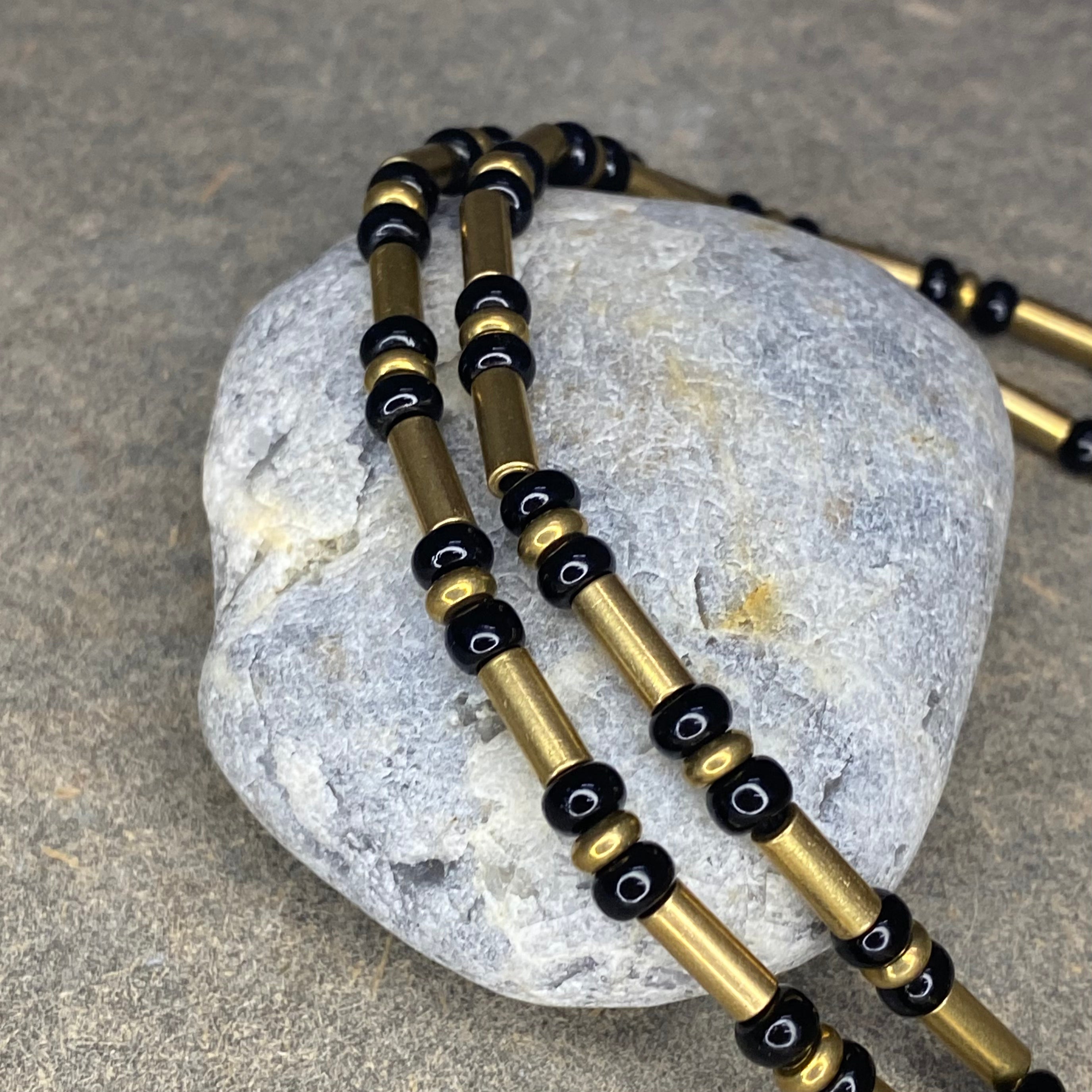 MATERIAL: This Large Coin Black Necklace is made of three large brass pendant, tube brass beads and black glass beads.