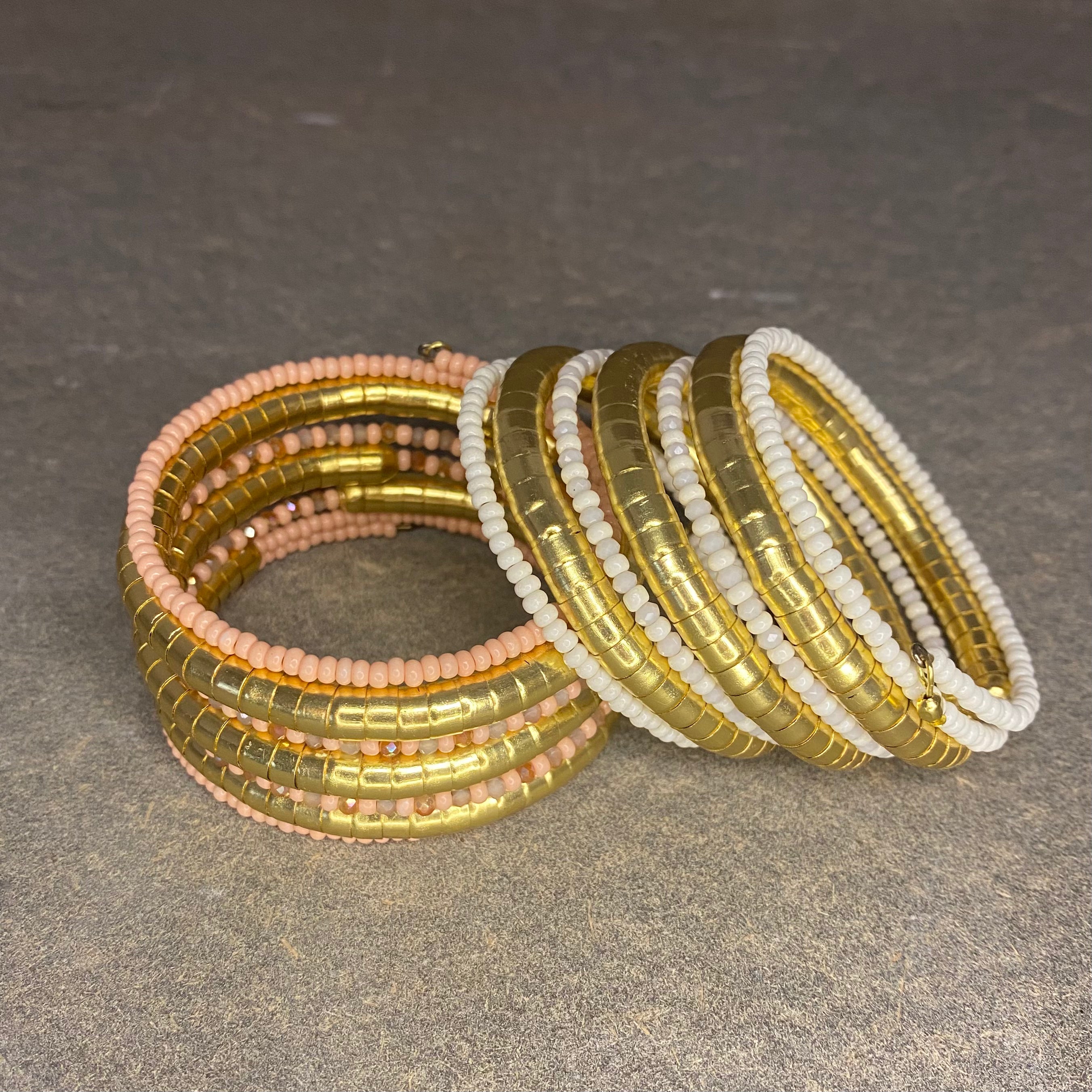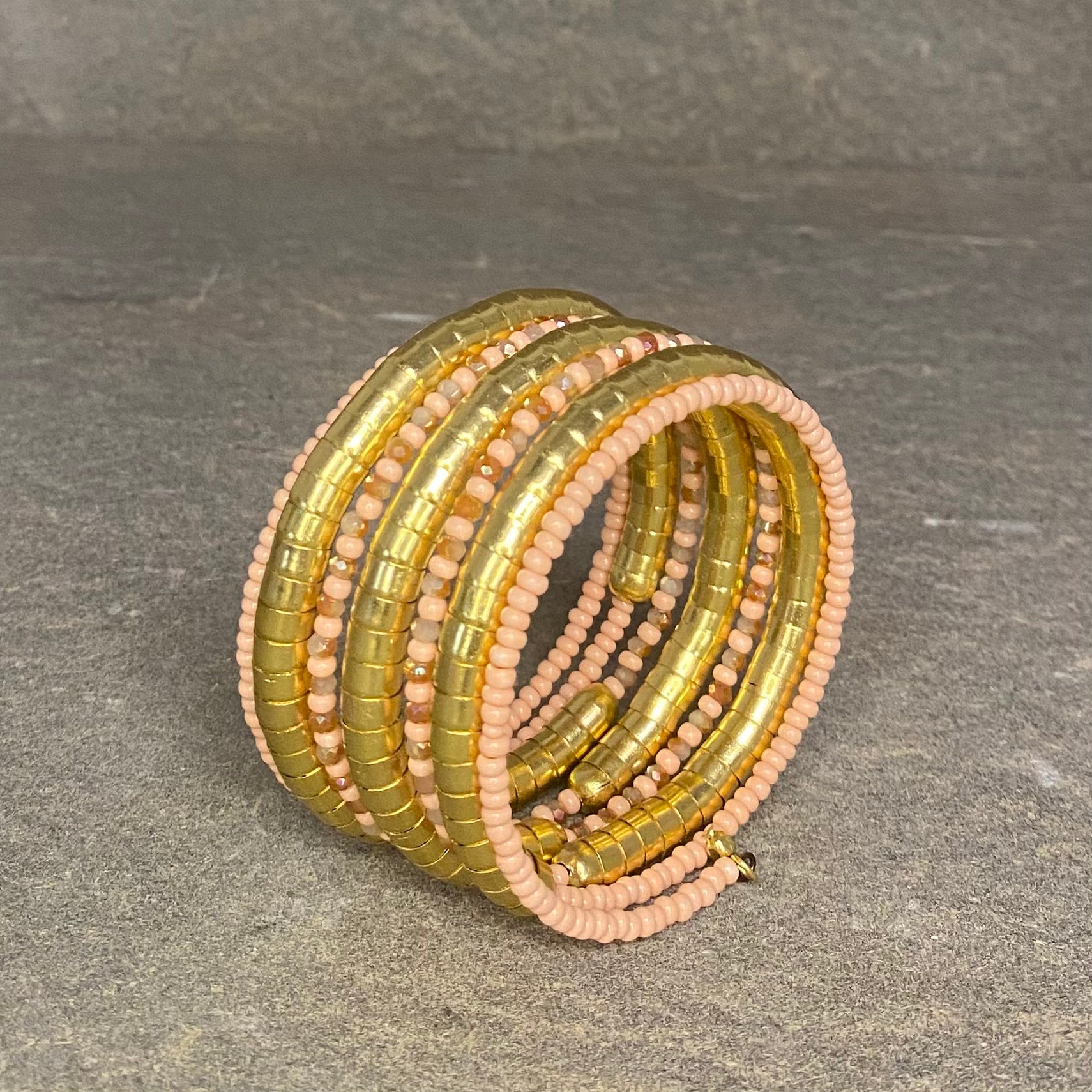 This handcrafted bracelet combines golden brass beads with pink beads, creating a striking contrast of shine and simplicity. Lightweight and versatile, it’s perfect for stacking or wearing solo, bringing a touch of boho-chic style to your outfit.