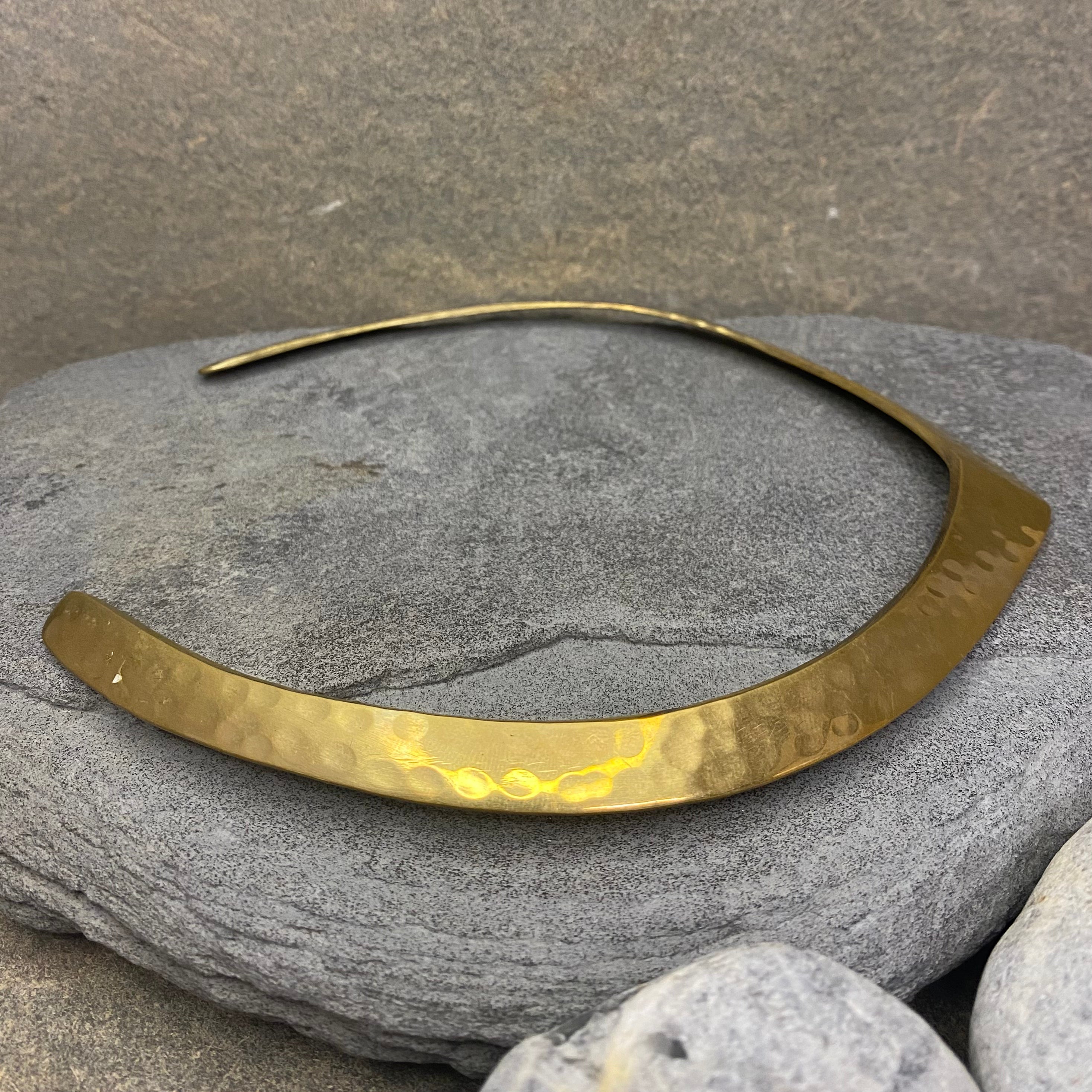 This bold hammered brass collar necklace is a statement piece that blends elegance with earthy charm. Its sleek, curved design highlights the neckline beautifully, making it the perfect accessory for both modern minimalism and bohemian style.