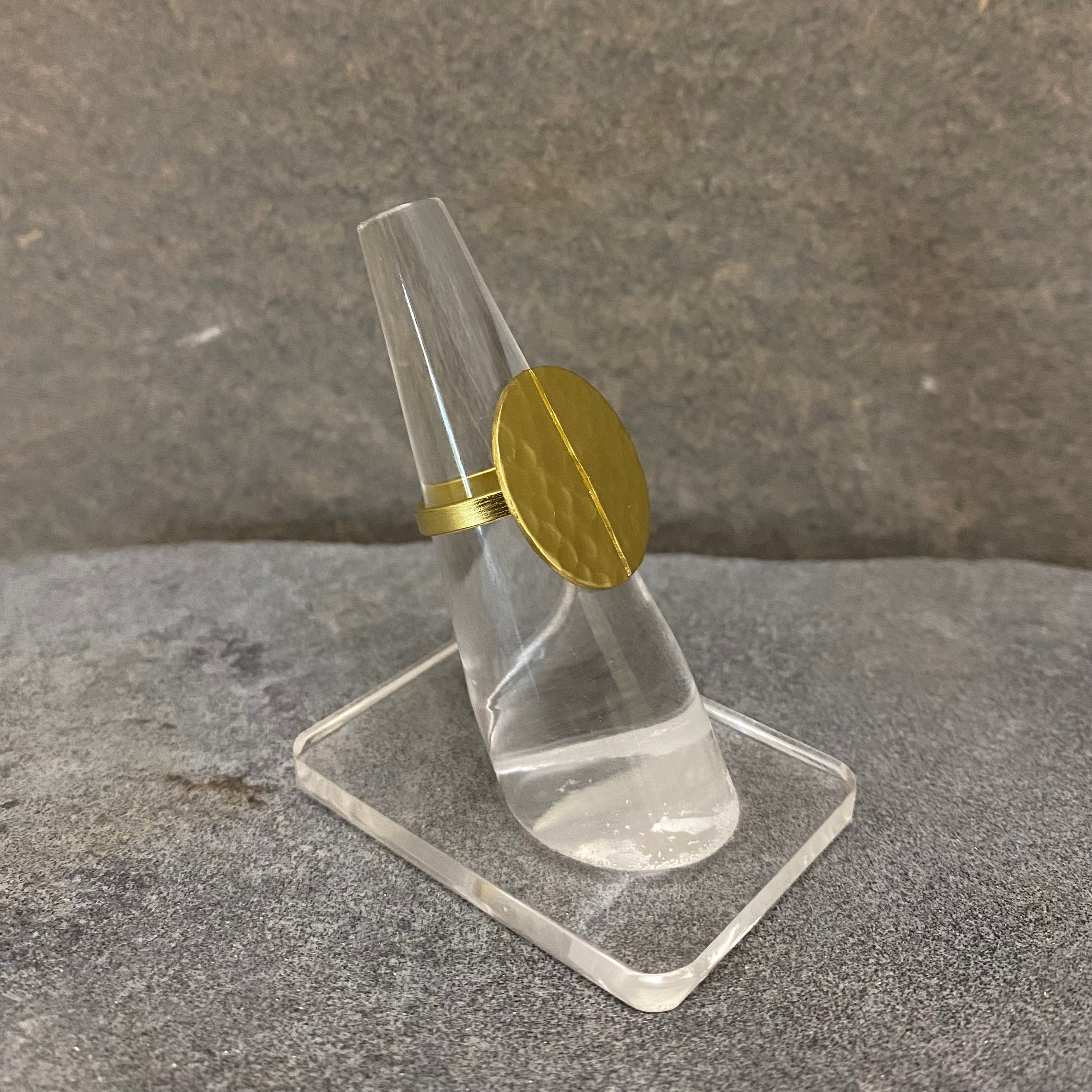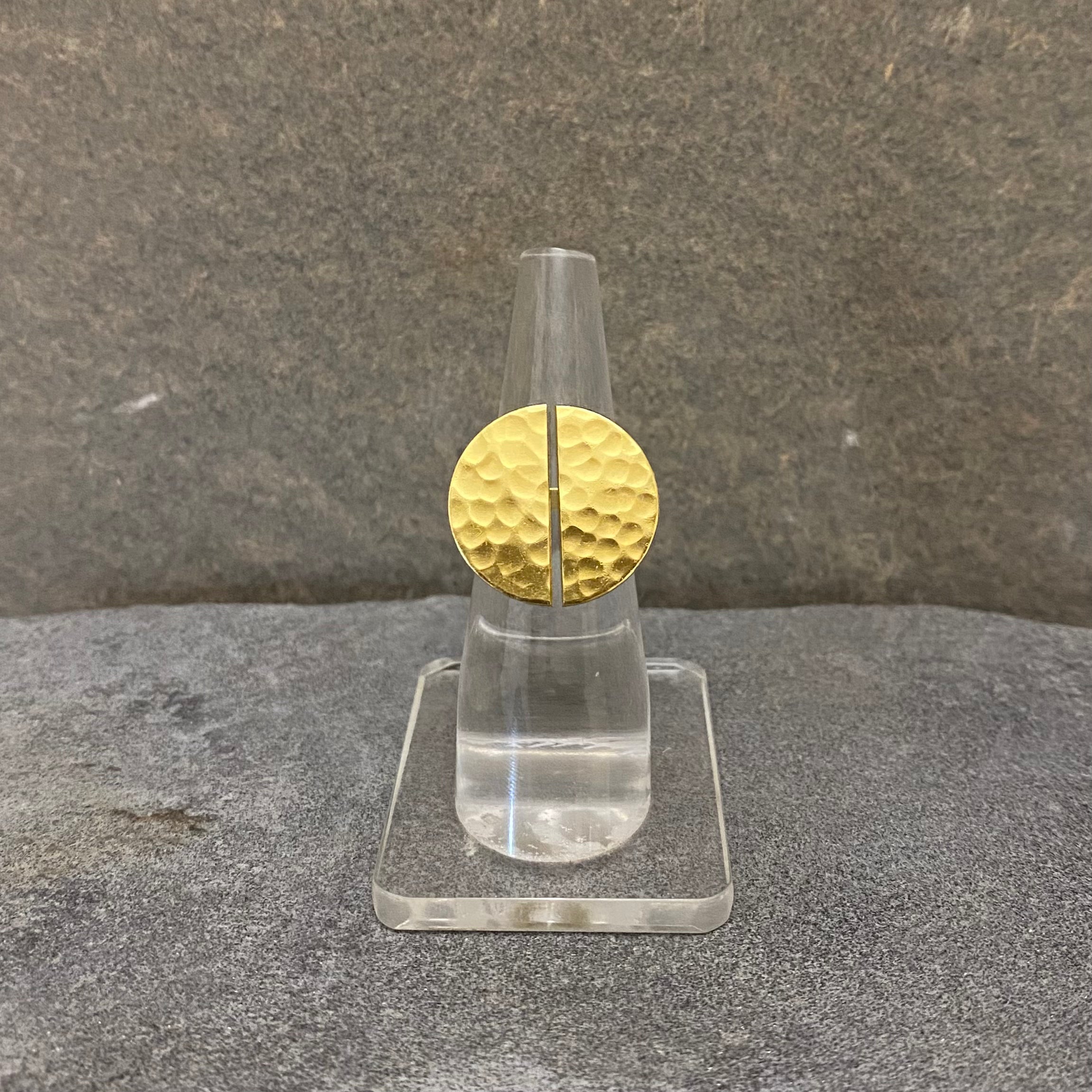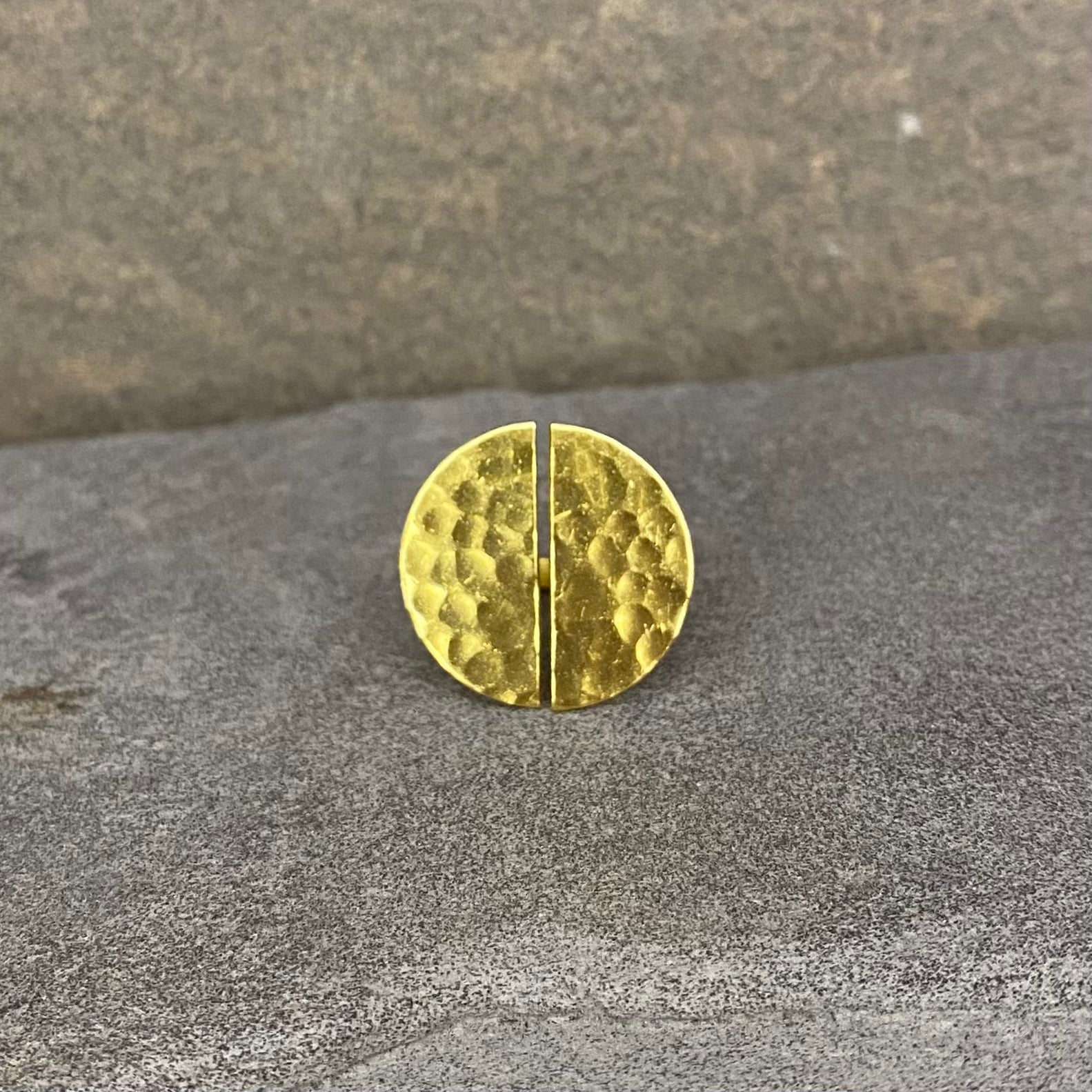 This bold statement ring is crafted from brass with a hammered disc design split at the centre. Its textured surface reflects light beautifully, making it a striking accessory that blends minimalism with artisanal charm.