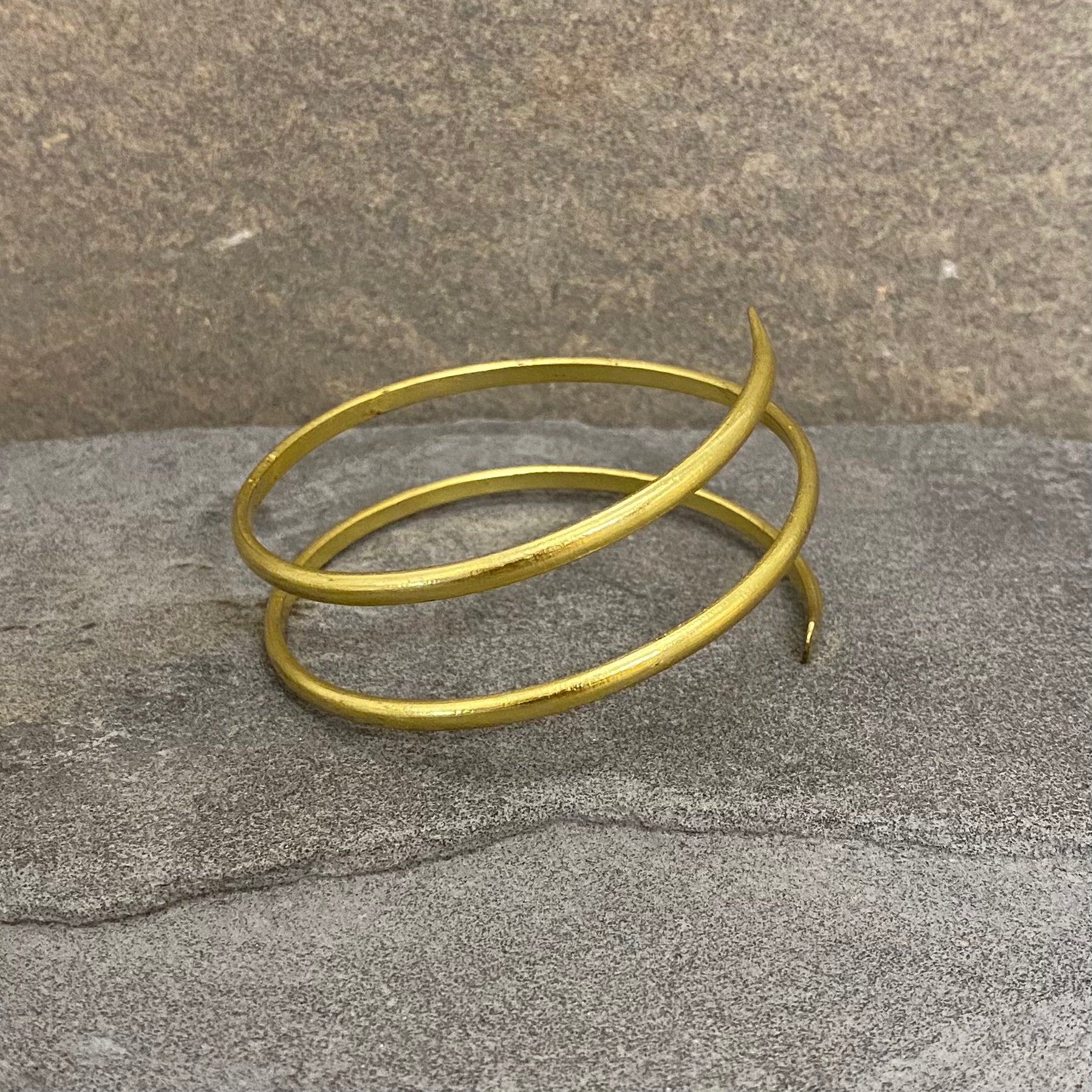 A minimalist open bangle crafted from brass, designed with a smooth spiral wrap shape that coils elegantly around the arm. Its clean and versatile style makes it perfect for layering or wearing solo.