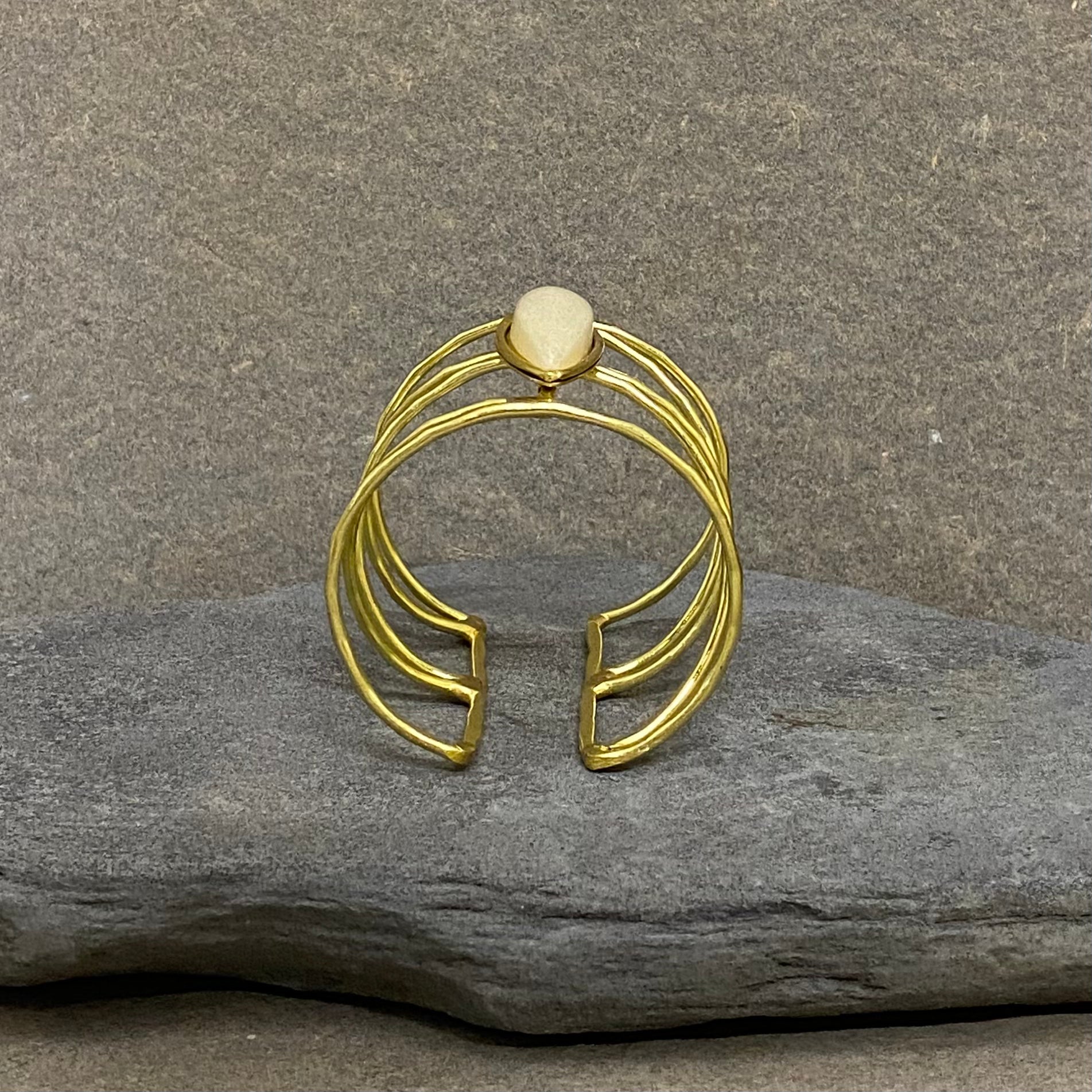 This open brass cuff features a natural stone centrepiece set in a geometric frame. The mix of earthy tones and polished brass creates a balance of raw elegance and modern design, making it both a statement piece and an everyday accessory.