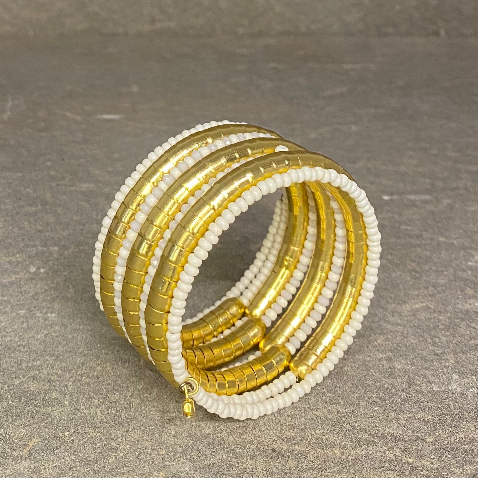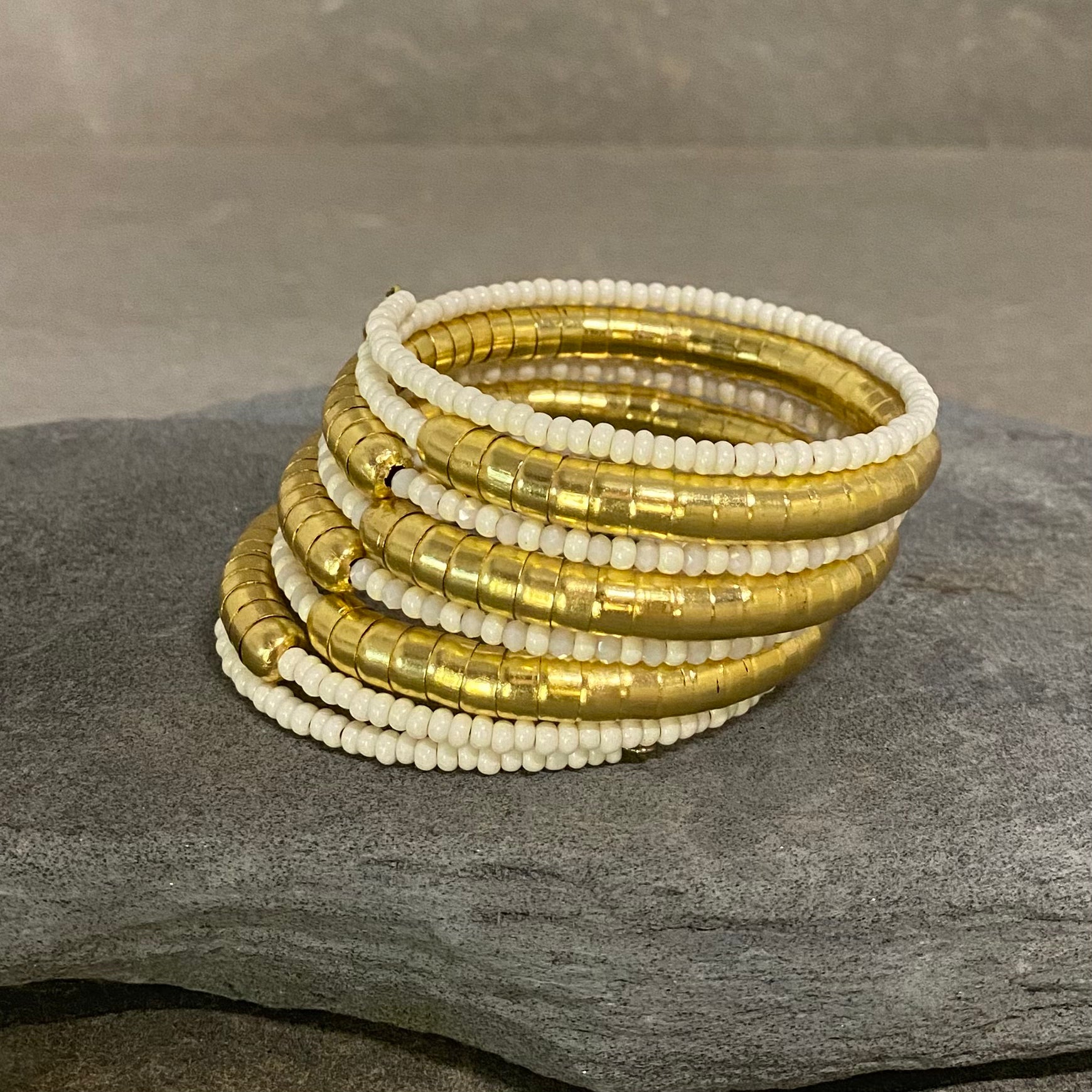 This handcrafted bracelet combines golden brass beads with white beads, creating a striking contrast of shine and simplicity. Lightweight and versatile, it’s perfect for stacking or wearing solo, bringing a touch of boho-chic style to your outfit.