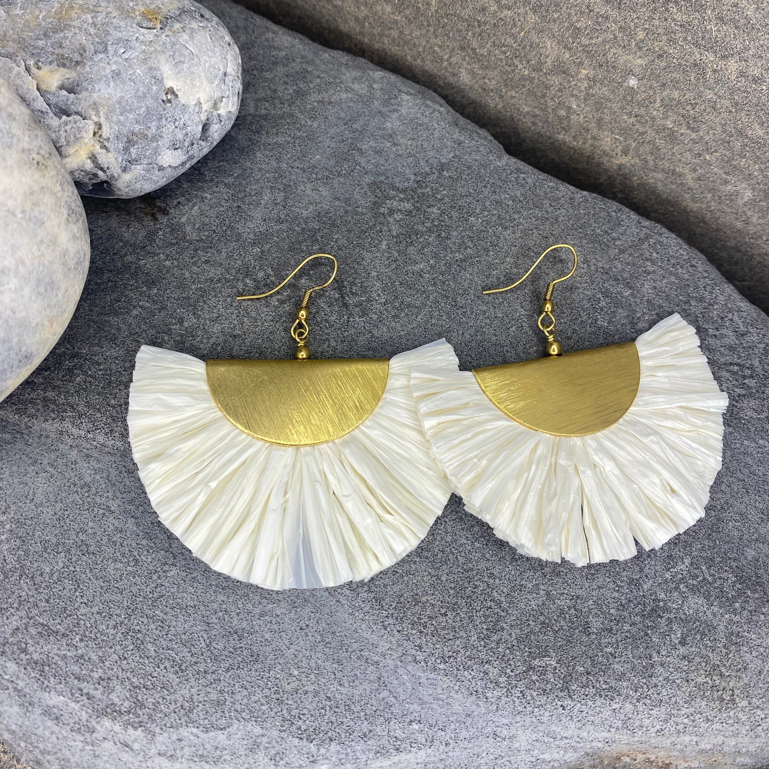 MATERIAL: This pair of White Tassel Earrings is made out of natural raffia and brass.