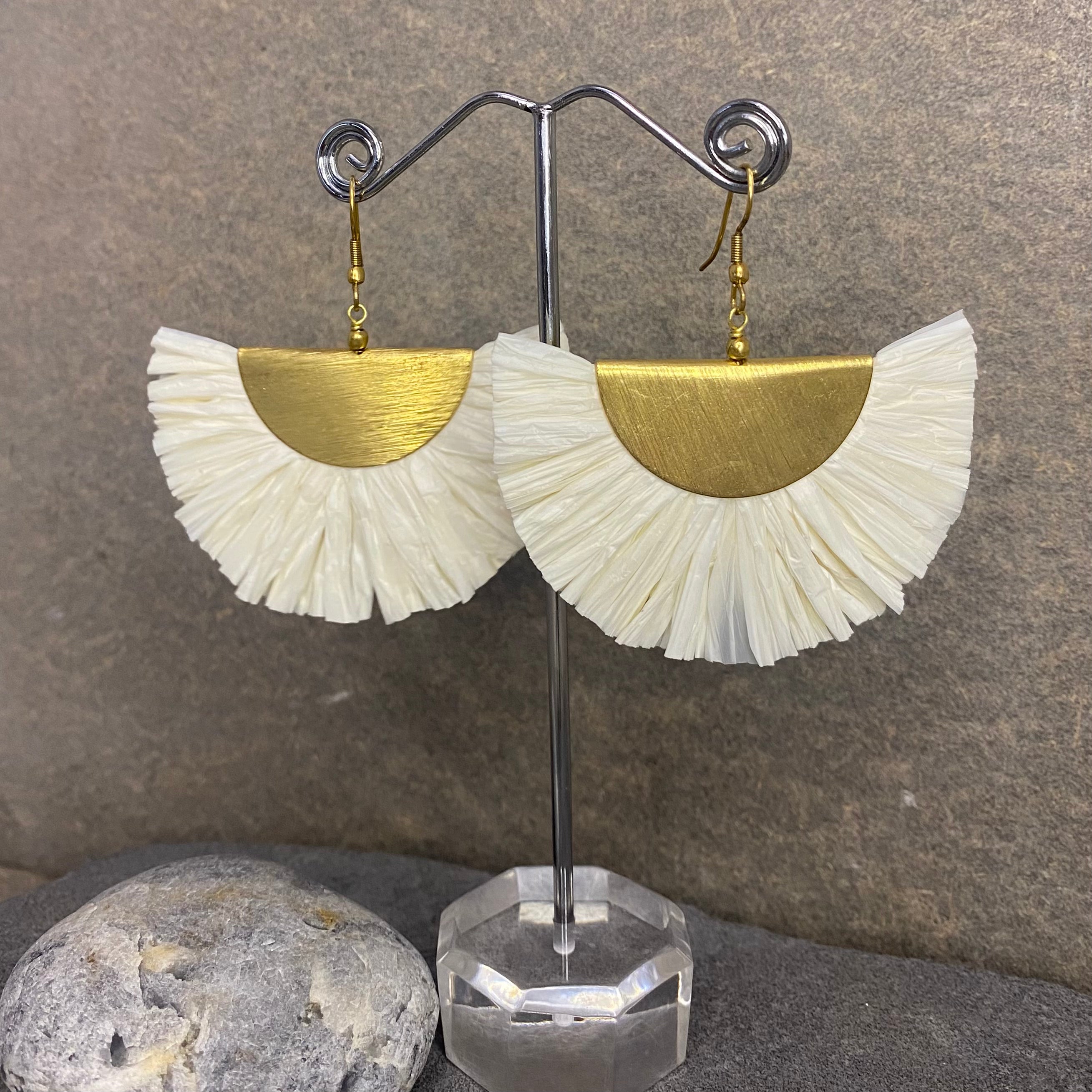 These eye-catching brass and raffia earrings combine a half-moon brass plate with soft white fringes. Lightweight yet bold, they’re the perfect statement piece for adding movement, texture, and a touch of boho elegance to any outfit.
