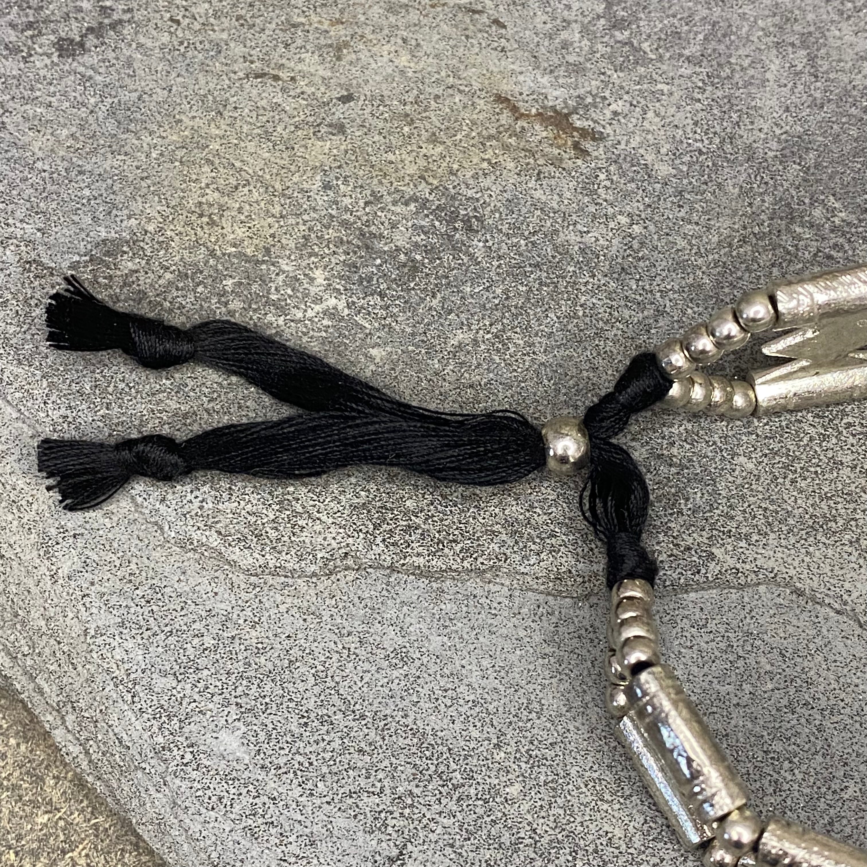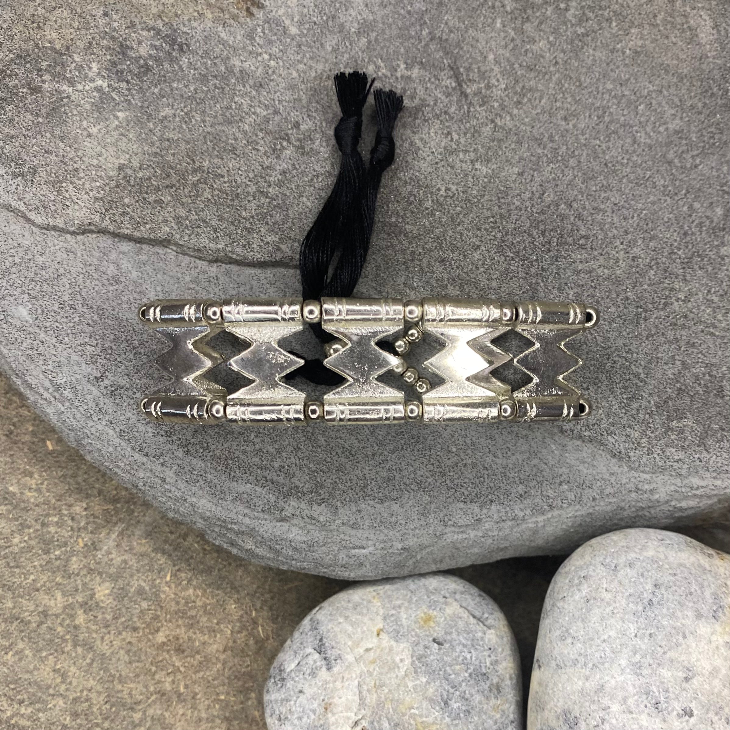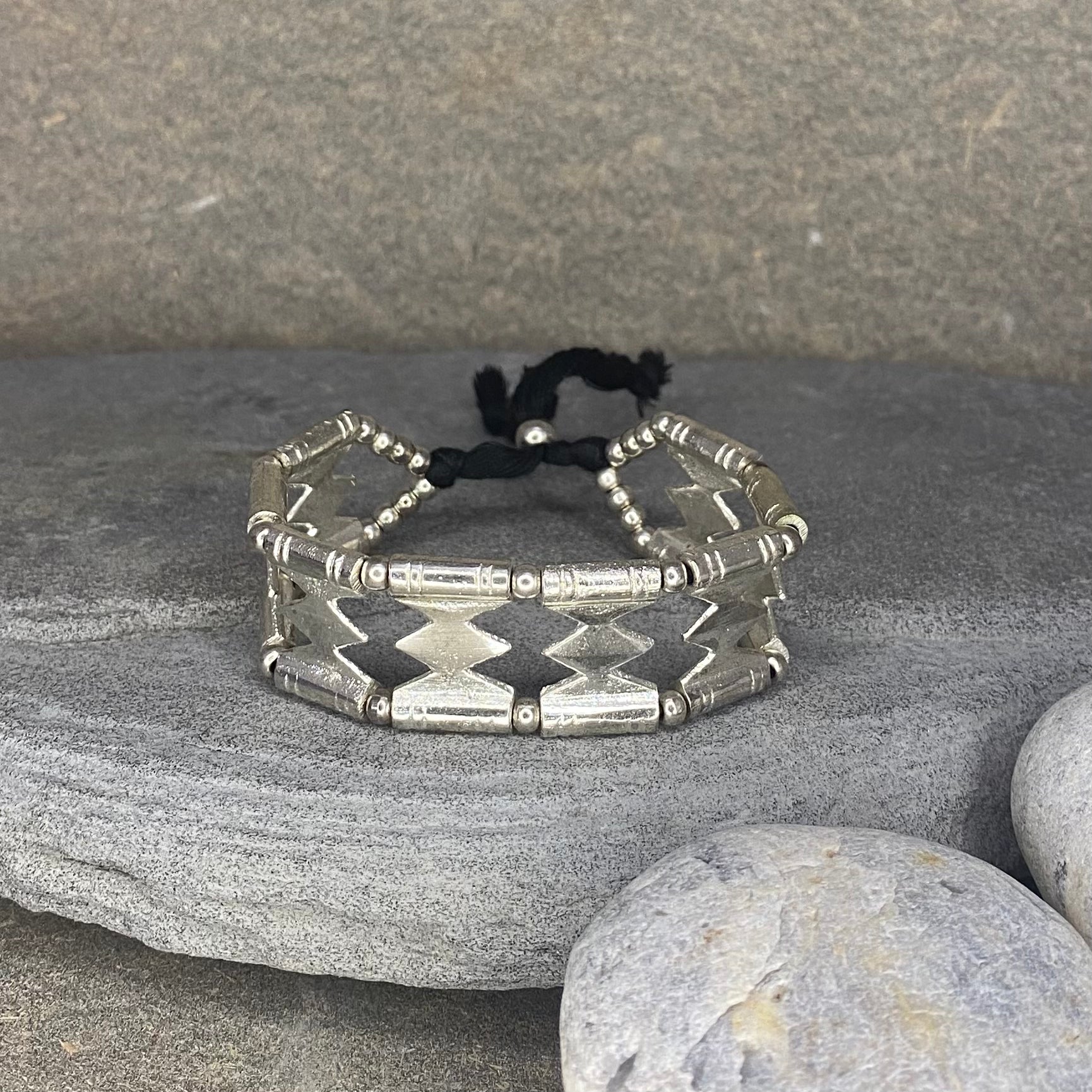 A striking bracelet made with cylindrical and zigzag-cut silver beads, arranged in a tribal-inspired geometric pattern. The silver tones give it a cool feel, while the black woven cord provides durability and adjustability.